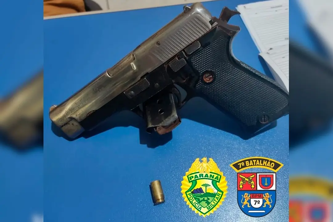 Um homem foi preso pela Polícia Militar (PM) em Mariluz, após efetuar disparos de arma de fogo para o alto no centro de Mariluz. Ele estava em posse de uma pistola 9 milímetros.