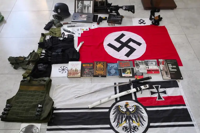 Os mandados foram cumpridos em dois endereços localizados no bairro Uvaranas. Durante a ação, os policiais apreenderam diversos itens vinculados à ideologia nazista, como bandeiras, desenhos e fotografias de Adolf Hitler. Além disso, a PCPR apreendeu equipamentos eletrônicos, duas armas de airsoft, facas, dois coletes balísticos e munições.