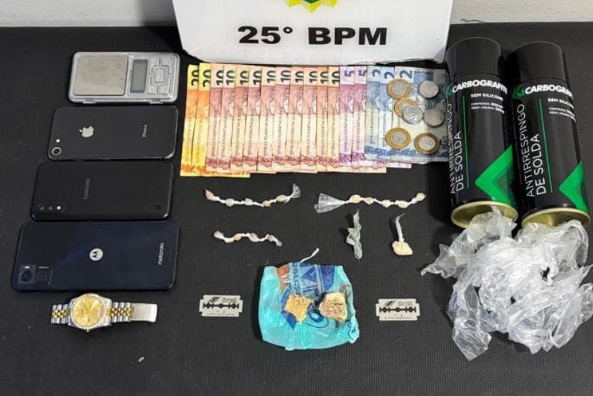 Durante a abordagem, os policiais encontraram 1 grama de cocaína, 10 gramas de crack (fracionadas em buchas e uma porção maior), além de R$ 161,50 em espécie, três celulares, um relógio de pulso, uma balança de precisão escondida em um matagal nos fundos do imóvel, duas lâminas tipo gillette, 14 embalagens plásticas e duas latas de carbografite — substância inalante comumente utilizada como droga recreativa.