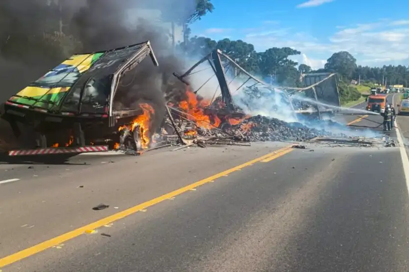 Um grave acidente entre dois caminhões deixou veículos em chamas e interditou completamente a BR-373, em Imbituva, na tarde desta terça-feira (20). Ainda não se sabe a causa exata da colisão, mas informações preliminares da Polícia Rodoviária Federal (PRF) indicam possíveis vítimas fatais.