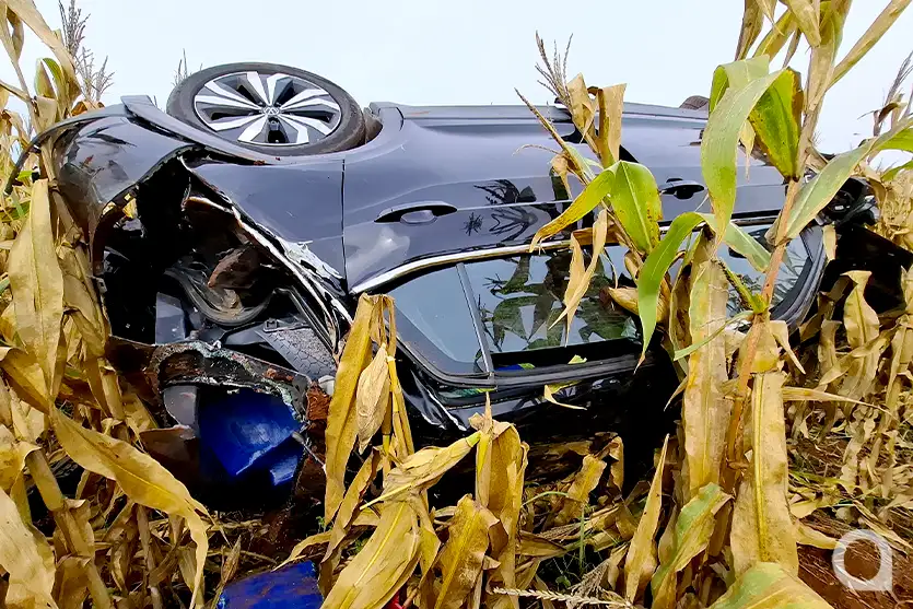Durante o acompanhamento tático, o T-Cross capotou ao atravessar uma plantação de milho. Mesmo ferido, o condutor fugiu a pé e foi localizado a cerca de 800 metros do local do acidente com o auxílio do cão farejador Porã, da 5ª Companhia Independente da PM (5ªCIPM).