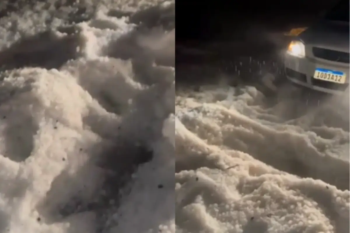Um carro acabou atolando em uma espessa camada de gelo acumulada após uma chuva de granizo sobre a ERS-486, em Itati, no Litoral Norte do Rio Grande do Sul (RS), entre a noite desta quarta-feira (4) e a madrugada de quinta (5). A cena incomum ocorreu após uma intensa queda de granizo que surpreendeu os moradores e motoristas que circulavam pela região.