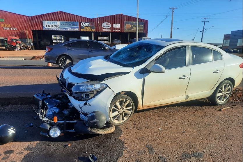 Um motociclista ficou ferido após colidir com um carro que manobrava para entrar em uma garagem no Jardim Maria Lúcia, em Umuarama, na manhã desta sexta-feira (13).