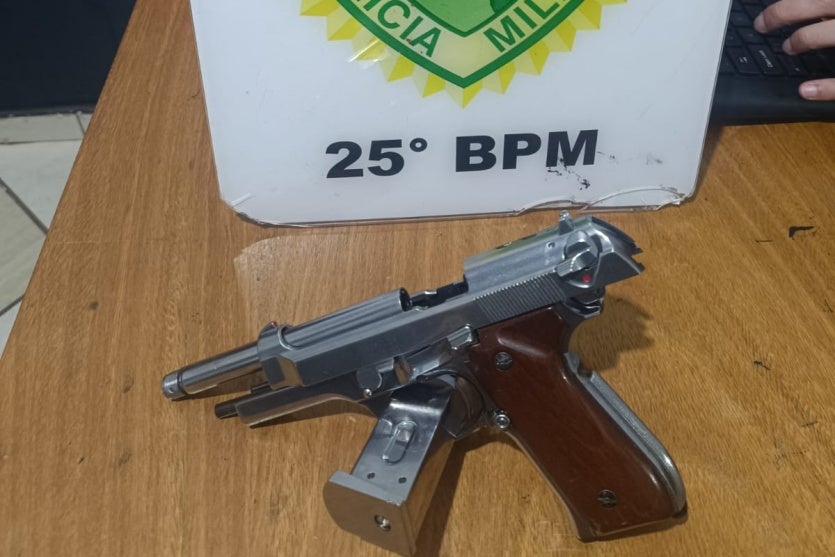 A terceira ocorrência ocorreu às 23h21, na avenida Paraná. Durante patrulhamento, uma equipe foi alertada por um pedestre sobre um homem que havia ameaçado uma mulher com uma arma. O casal foi localizado nas proximidades de uma pizzaria. No momento da abordagem, o suspeito, de 31 anos, sacou da cintura um simulacro de pistola e o jogou ao chão. Ele foi contido e algemado.