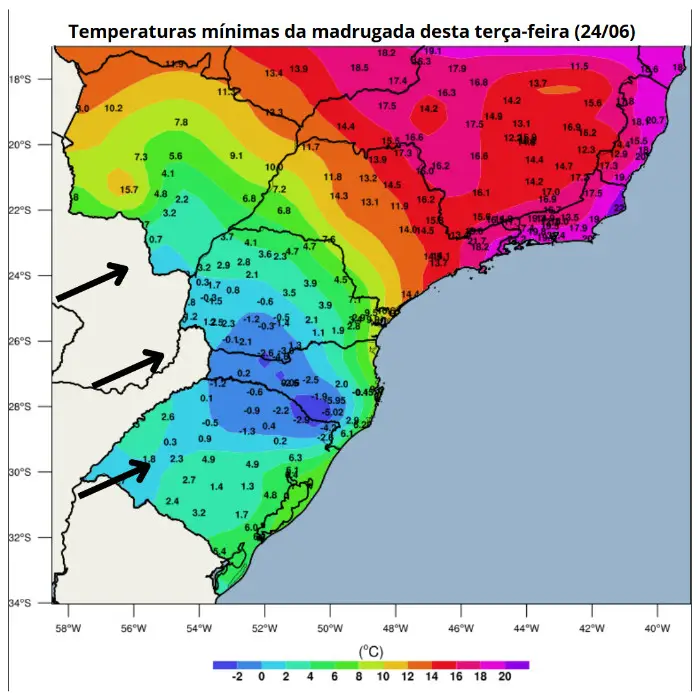 Um mapa divulgado pelo Simepar e pelo Instituto Nacional de Meteorologia (Inmet) mostra as temperaturas mínimas registradas pelas redes de estações meteorológicas em todo o território estadual.