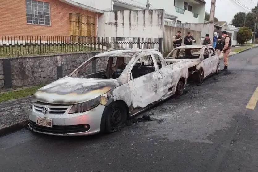 Saveiro e Gol foram completamente destruídos pelo fogo; terceira vítima do vandalismo foi uma BMW, danificada por dentro (Foto Banda B)