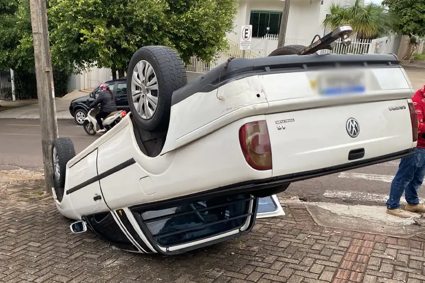 Saveiro para de ‘ponta-cabeça’ após colisão com Astra em cruzamento de Umuarama