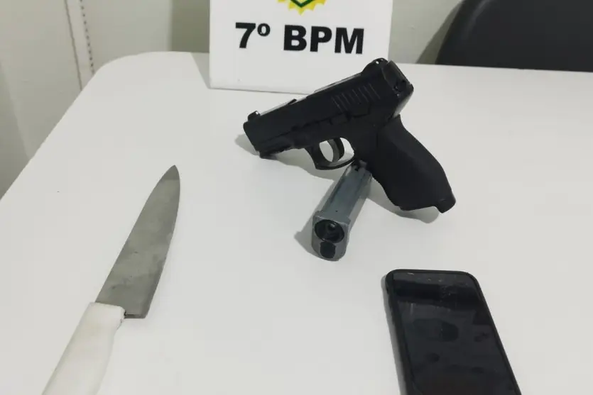 O suspeito conduzia um VW Gol prata quando foi abordado por uma equipe da Rádio Patrulha Auto (RPA) da Polícia Militar. Segundo o relato policial, durante a abordagem pessoal não foram encontrados itens ilícitos. No entanto, ao revistar o interior do veículo, os agentes localizaram um simulacro de pistola, uma faca e um telefone celular.