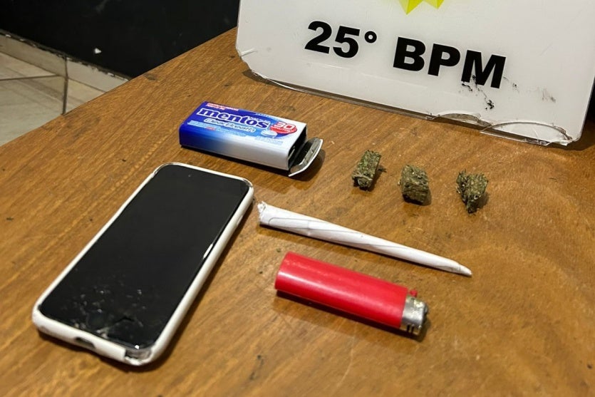 Na abordagem, nada de ilícito foi encontrado diretamente com os jovens. No entanto, ao verificar o material descartado, os policiais localizaram três porções de substância análoga à maconha, totalizando sete gramas, além de um isqueiro e duas embalagens plásticas.