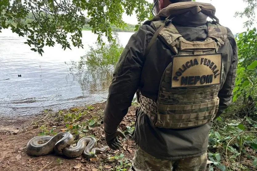 Sucuri foi encontrada nesta quinta (3) e transportada com segurança para o habitat natural; ação envolveu PF e equipes municipais (Foto Nepom)