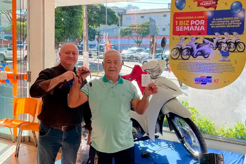 A Rede de Supermercados Planalto está comemorando seu 67º aniversário com uma campanha que está movimentando a cidade: o sorteio de uma Honda Biz 125 0 km por semana. O primeiro sorteio foi realizado no sábado, dia 5 de julho, e o grande contemplado foi o Sr. Izaquias Soares de Almeida, que já garantiu a sua Biz novinha.