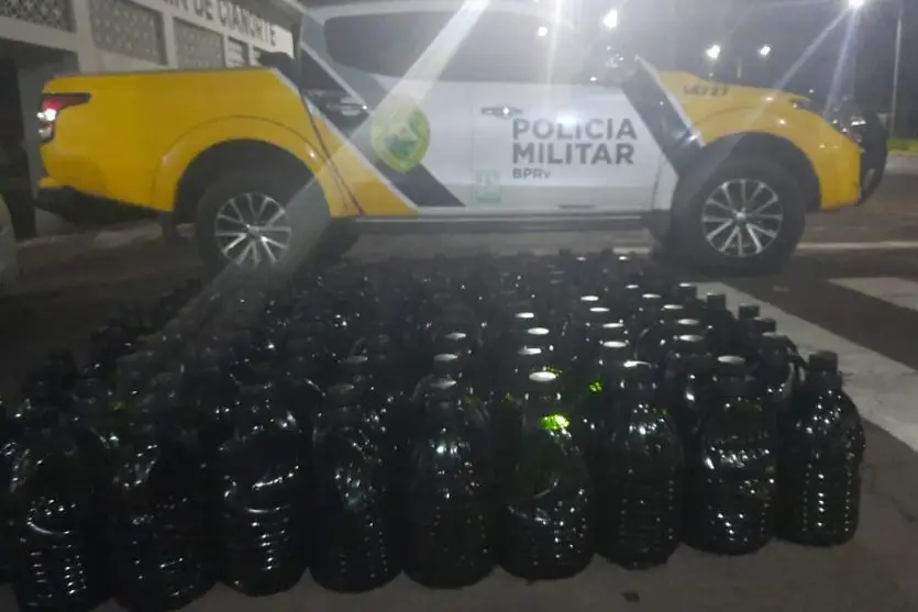 Galões de azeite foram encontrados em carro de passeio abordado por policiais rodoviários na madrugada desta terça-feira (15) (Foto PMPR)