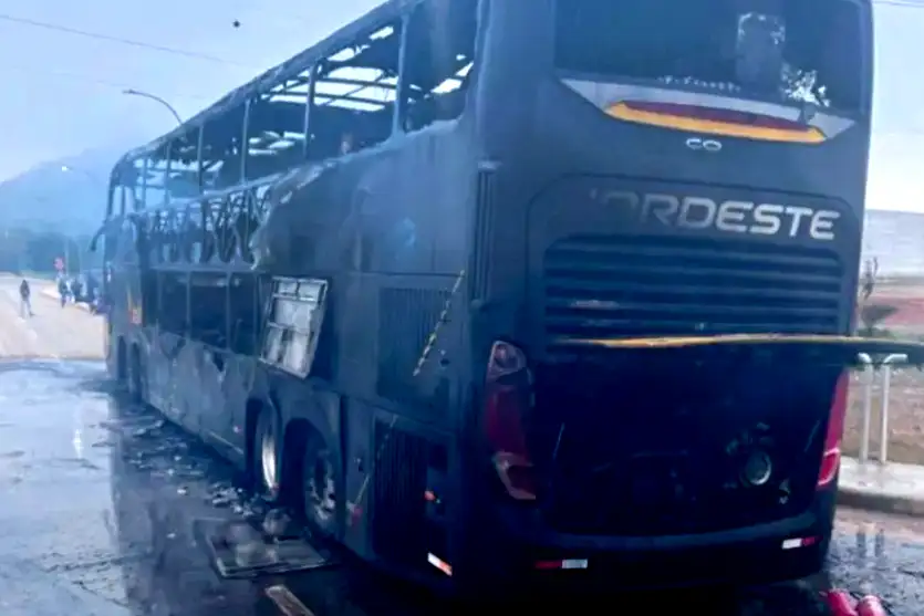 Em outras imagens do Corpo de Bombeiros, que inclusive estão nesta matéria, o ônibus aparece completamente em chamas, com a estrutura comprometida e o interior totalmente destruído.