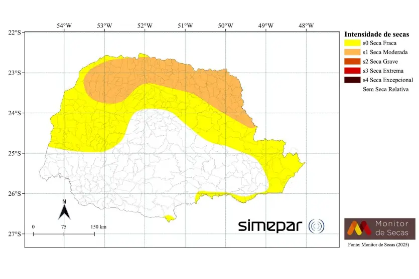 Já no Noroeste e Oeste do Paraná, a seca moderada recuou. O mapa paranaense, portanto, ficou com a metade sul sem seca, com uma faixa de seca fraca do Litoral até o Noroeste, e outra faixa, menor do que nos meses anteriores, de seca moderada na área de divisa com São Paulo.