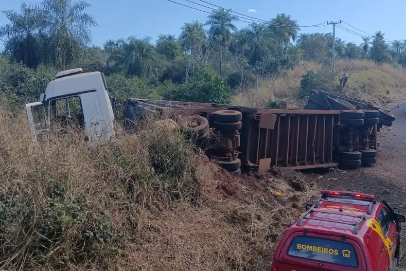 Carreta canavieira tomba na PR-487, em Icaraíma (PR); motorista morreu no local por estar sem cinto, segundo os bombeiros (Foto Corpo de Bombeiros)