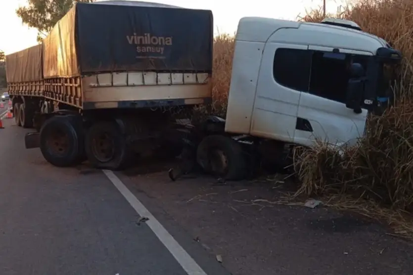 O caminhoneiro tentou desviar para evitar uma colisão frontal, mas o automóvel atingiu a lateral da carreta. O impacto arrancou o tanque de combustível e danificou o rodado do caminhão.