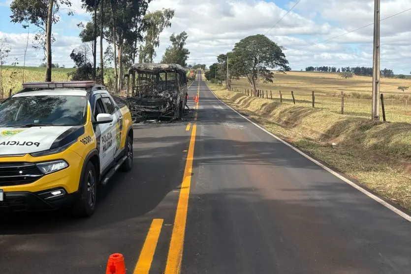 Um ônibus pegou fogo na manhã de segunda-feira (28), por volta das 11h30, no km 16+400 metros da PRC-494, no trecho entre Paranacity e São João do Caiuá, no noroeste do Paraná. Apesar do susto, ninguém ficou ferido.