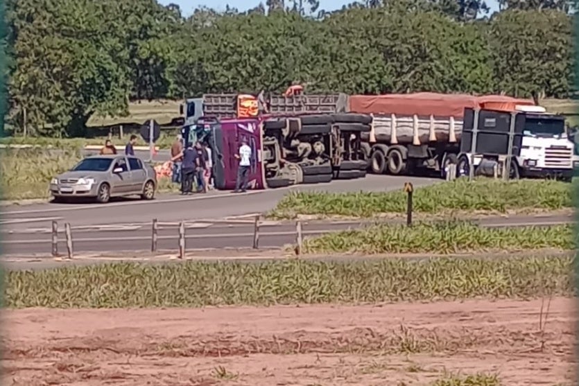 Um caminhão tombou no fim da manhã desta terça-feira (29) no entroncamento da PR-323 com a BR-487, conhecida como Estrada Boiadeira, em Cruzeiro do Oeste. Segundo a Polícia Rodoviária Estadual (PRE), o motorista pode ter perdido o controle do veículo ao fazer o contorno do trevo de acesso à BR-487. Apesar do susto, não houve feridos.