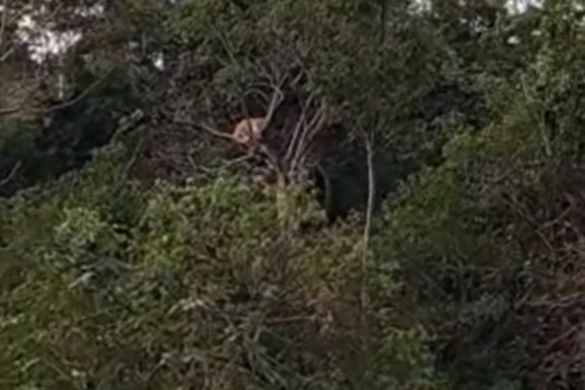 Um morador do bairro San Marino, em Umuarama, registrou em vídeo uma onça-parda na copa de uma árvore, na manhã desta quarta-feira (30). O animal foi flagrado ainda no início do dia, em uma mata ao lado da área residencial.