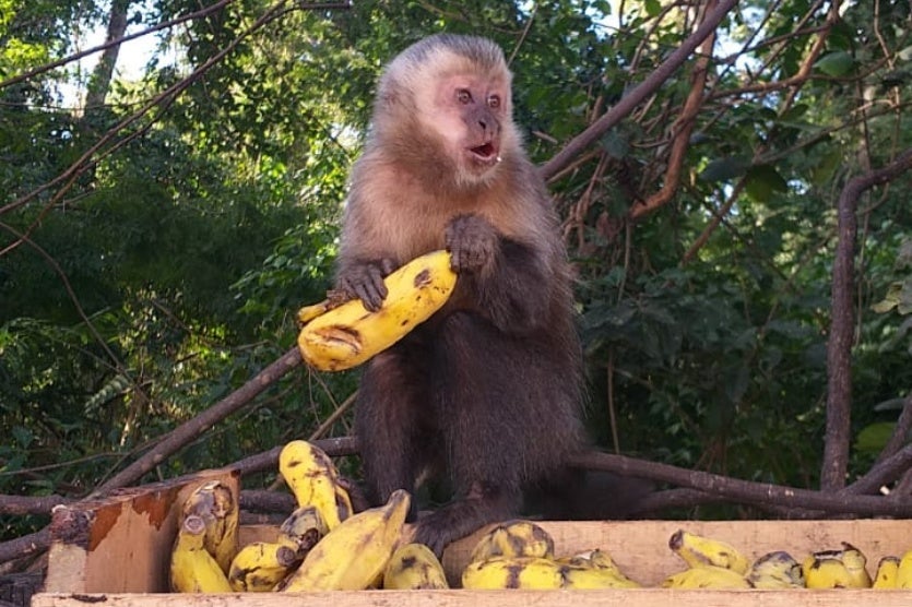 “As frutas alimentam todos, desde os macacos-prego até pássaros e insetos. Porém, pedimos que sejam frutas em boas condições, pois as estragadas acabam acumulando no chão, atraem mosquitos e podem causar doenças. Caso a pessoa traga uma quantidade maior, pode deixar conosco, na residência em frente à mata, pois armazenamos na geladeira e distribuímos aos poucos”, explica Denise.