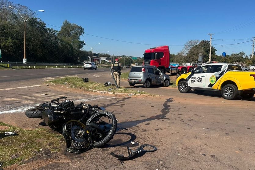 Uma colisão entre um carro e uma motocicleta na PR-323, no trecho urbano de Umuarama, deixou duas pessoas feridas e resultou na destruição total da moto, que pegou fogo logo após o impacto. O acidente ocorreu por volta das 12h40 desta quinta-feira (14), no trevo do parque de exposições Dario Pimenta da Nóbrega.