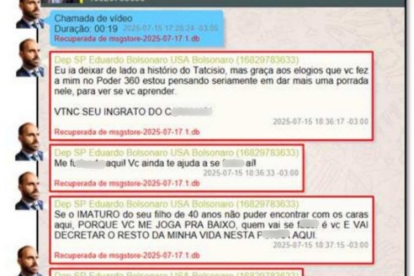 Em uma das mensagens, Eduardo escreveu ao pai: “Eu ia deixar de lado a história do Tarcísio, mas graças aos elogios que você fez a mim no Poder 360 estou pensando seriamente em dar mais uma porrada nele, para ver se você ‘aprender’. * SEU INGRATO DO **!”