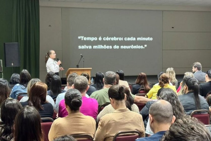 Durante sua fala, Renilde exibiu o vídeo de uma paciente que, após sofrer um AVC, recebeu o protocolo medicamentoso no tempo adequado, recuperando-se sem sequelas significativas. O caso emocionou os presentes e reforçou a mensagem central do treinamento: a rapidez no atendimento salva vidas.