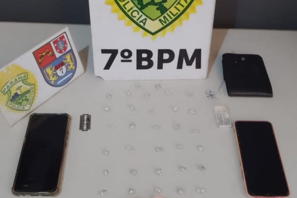 Na sequência, os agentes flagraram dois homens já conhecidos por envolvimento com tráfico. Durante buscas pessoais e no terreno, foram localizadas 31 pedras de crack prontas para a venda, somando 8,1 gramas, além de celulares, dinheiro e materiais usados para fracionamento da droga, como papel alumínio e lâmina de gilete.