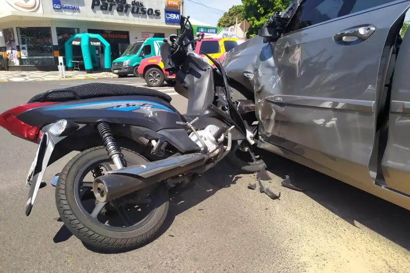 A colisão ocorreu quando o motorista do carro atravessou a avenida Brasil. A condutora da moto, que estava na via preferencial, acabou atingindo o Onix. Com o impacto, a motoneta ficou cravada entre o pneu dianteiro esquerdo e o para-lama.