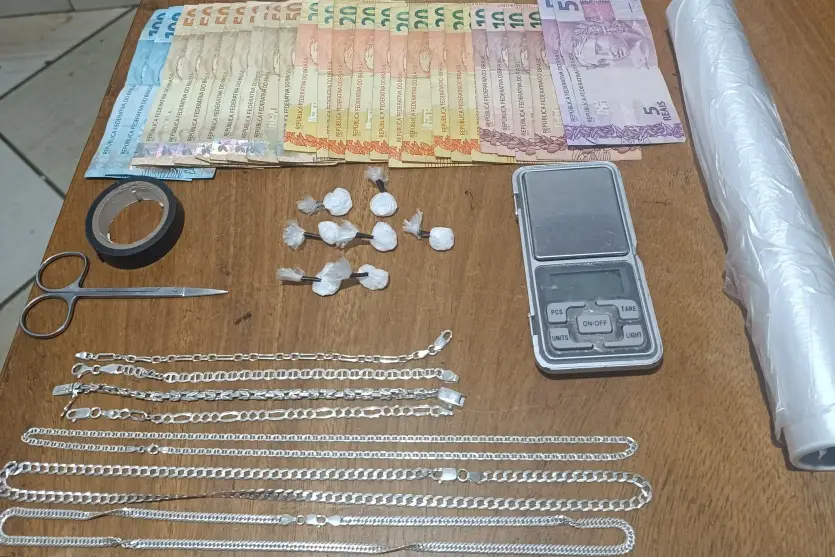 No local, o morador autorizou a entrada da equipe policial, que encontrou sete porções de cocaína, uma balança de precisão, sacolas plásticas, fita isolante, uma tesoura, além de R$ 850,00 em espécie. Também foram apreendidos três colares e quatro pulseiras de prata, sem comprovação de origem.