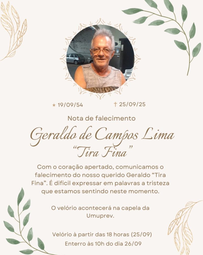 O velório de Geraldo terá início nesta quinta-feira (25), às 18h, na Capela da Umuprev. O sepultamento será realizado nesta sexta-feira (26), às 10h, no Cemitério Municipal de Umuarama. A família convida à comunidade para participar da despedida e prestar as últimas homenagens.