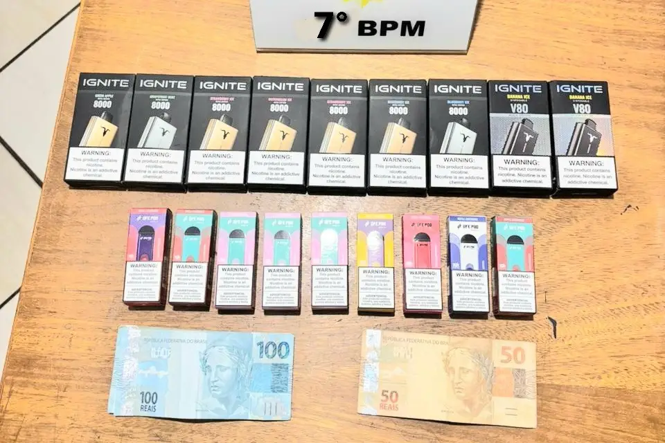 O veículo abordadopela PM na situação transportava três ocupantes. Na revista pessoal, nada de ilícito foi encontrado. Já na busca veicular, os policiais localizaram no porta-malas uma sacola com 19 cigarros eletrônicos de marcas variadas. Sob o estepe, havia diversas cédulas em espécie, somando R$ 1.400,00.