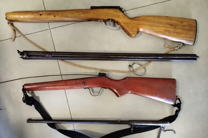 No local, foram encontradas duas espingardas de fabricação artesanal, sendo uma calibre .22 e outra calibre .32, ambas sem numeração de série ou marca de fabricante. O mandado foi expedido pela 2ª Vara Criminal de Umuarama.