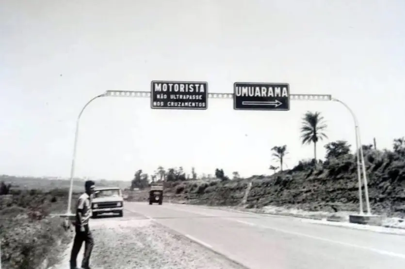 A PR-323 asfaltada no trecho Maringá a Umuarama ostentando as placas após a sua inauguração. Além da questão estratégica no escoamento das produções rurais, a nova rodovia passou a atender à demanda da população de usar a PR-323 para acessar outros centros do Estado e do Brasil oferecendo segurança e modernidade nas viagens - Foto: Acervo histórico de Italo Fábio Casciola