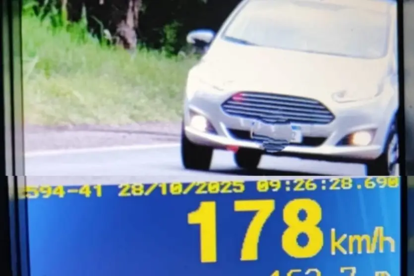 Um veículo foi flagrado a 178 km/h em pista molhada durante a Operação Radar, realizada na manhã desta terça-feira (28) pela Polícia Rodoviária Estadual (BPRv), na PR-317, entre Assis Chateaubriand e Toledo. A ação ocorreu entre 9h e 10h30, no km 368 da rodovia.