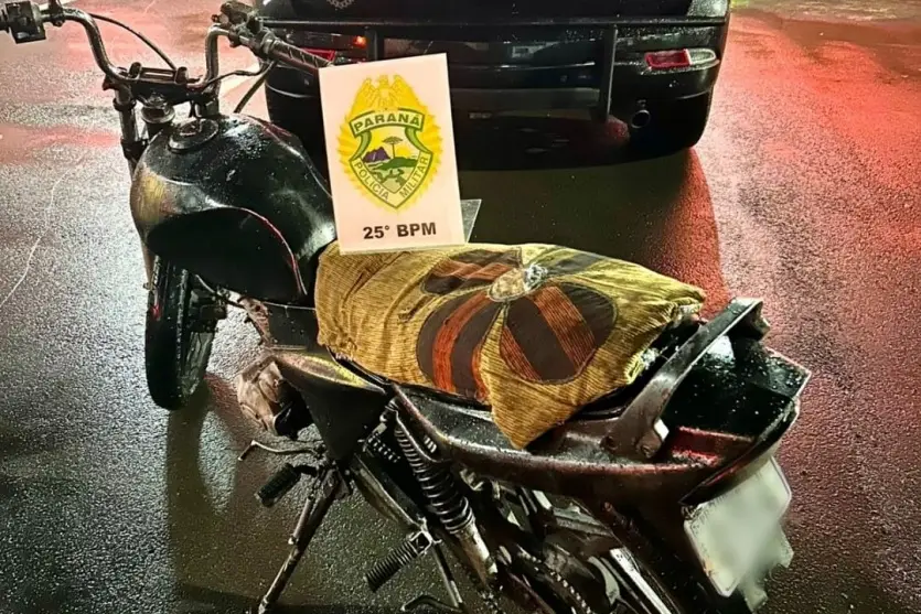 Durante patrulhamento por volta das 18h15min, os policiais avistaram uma motocicleta preta circulando sem painel, farol e espelhos retrovisores. A equipe realizou a abordagem e, após consulta ao sistema, constatou que a moto havia sido furtada em Perobal e que sua cor original era prata.