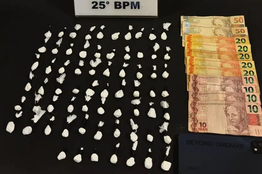 Durante as buscas, os policiais localizaram a sacola escondida, que continha 66 porções de substância análoga à cocaína embaladas para comercialização. No total, 68 porções da droga foram apreendidas, além do dinheiro e do aparelho celular.