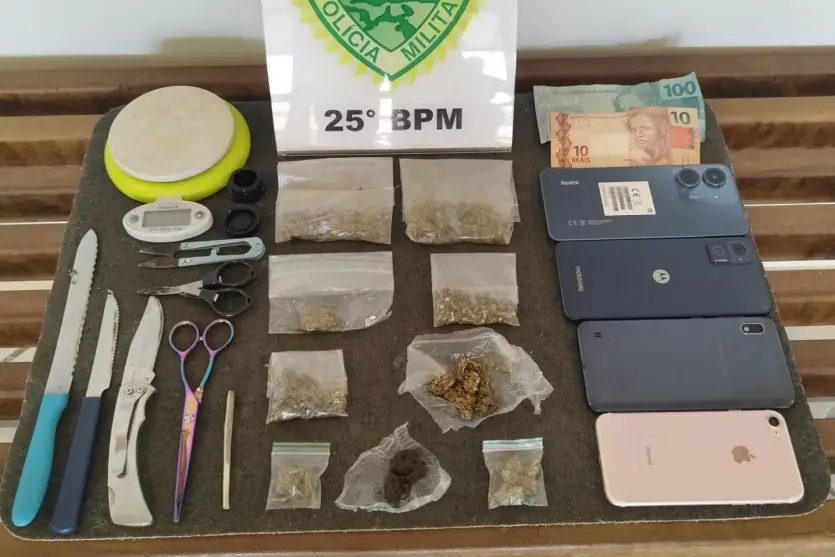 Na revista pessoal, foram encontradas pequenas porções de substância análoga à maconha. Diante da suspeita, os policiais realizaram diligências no interior da residência, onde localizaram mais porções da droga, uma balança de precisão, materiais utilizados para o fracionamento, dinheiro e uma nota de R$ 100 falsa.