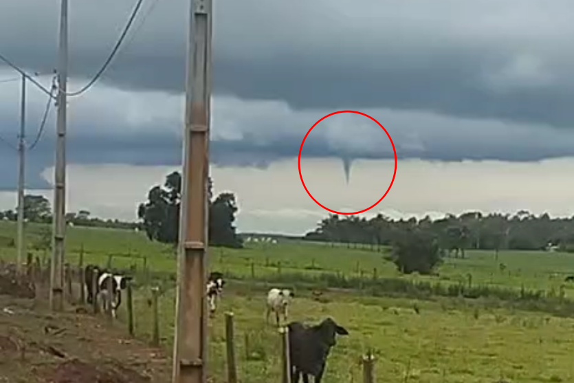 Trabalhadores de Umuarama que estavam prestando serviço no distrito de Rio Bonito, em Francisco Alves, registraram um fenômeno raro no fim da tarde desta quinta-feira (13). Uma nuvem funil se formou duas vezes e provocou medo. Heitor Gabriel, de 26 anos, fez as imagens e enviou para a redação do OBemdito.