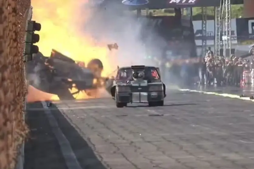O piloto paranaense Cadu Moreira saiu ileso de um grave acidente durante o evento de arrancada Armageddon 2025, no Velopark, em Nova Santa Rita (RS).