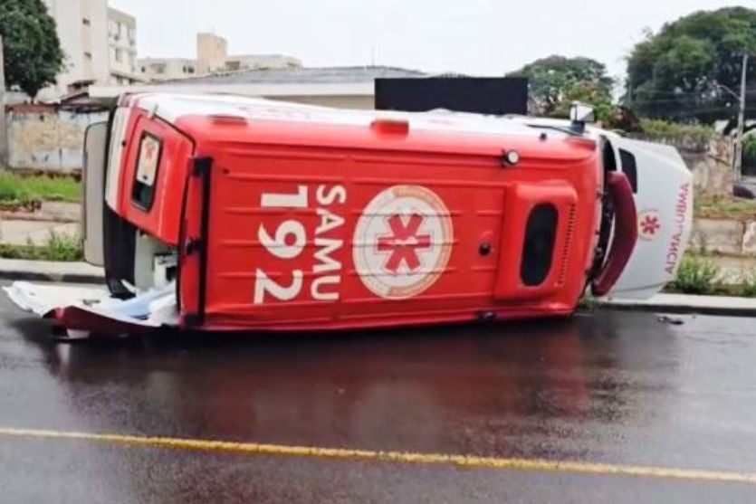 Uma ambulância do Serviço de Atendimento Móvel de Urgência (Samu) de Goioerê tombou após se envolver em uma colisão na tarde deste sábado (15), no cruzamento das ruas José do Patrocínio e Princesa Isabel, na Zona 5, em Maringá.