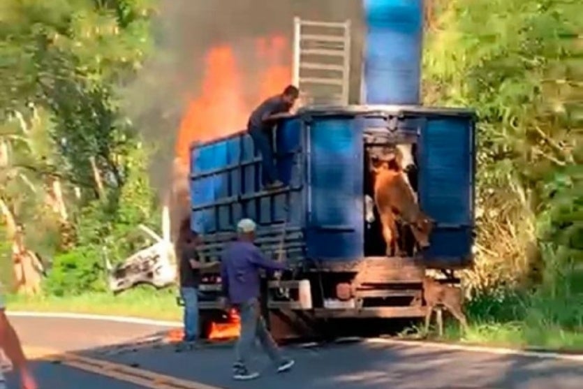 Vídeo mostra gado sendo retirado de caminhão em chamas na PR-317