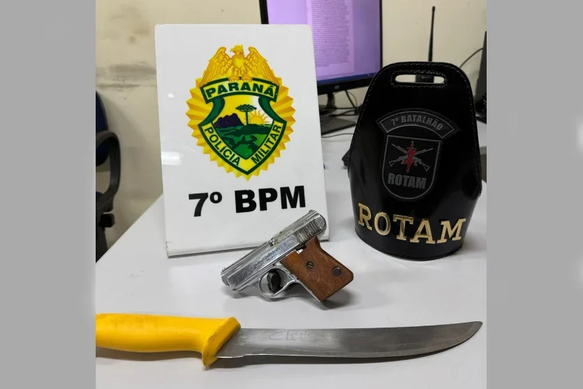 A equipe prendeu o suspeito, que não resistiu após ser localizado. Logo depois, os policiais recolheram a arma, a faca e demais materiais para encaminhamento oficial. O 7º BPM registrou a ocorrência como porte ilegal de arma de fogo de uso permitido.