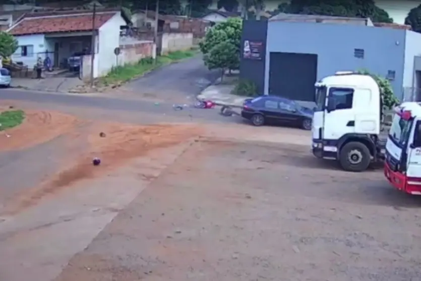 Um gravíssimo acidente registrado na manhã desta segunda-feira (24) no Jardim Pimentel, em Umuarama, deixou um motociclista ferido após uma colisão no cruzamento das ruas Geralda da Costa e Manoel Alves Silveira. As imagens de câmeras de monitoramento mostram o momento em que a motocicleta atinge a lateral de um automóvel e o capacete do condutor é arremessado para o alto com a força do impacto.