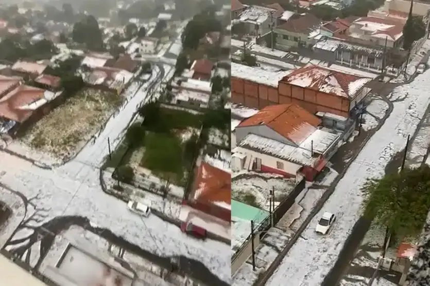 Uma forte chuva de granizo atingiu diferentes regiões de Ponta Grossa no fim da tarde desta segunda-feira (24), deixando ruas, calçadas e quintais cobertos por pedras de gelo. Imagens registradas por moradores, especialmente no bairro Uvaranas, mostram um cenário incomum, com o chão tomado por pequenas pedras brancas de cerca de 3 centímetros, lembrando uma camada de neve.