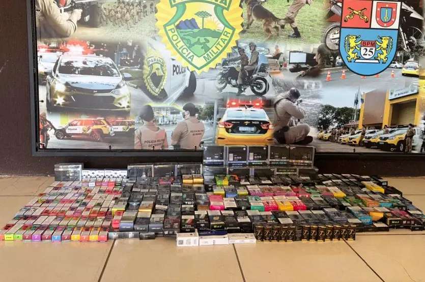 A Polícia Militar (PM) de Umuarama apreendeu uma carga de contrabando com um jovem condutor e sua sogra neste sábado (29). A ação ocorreu na PR-323 e a carga continha cigarros eletrônicos, anabolizantes e medicamentos, entre eles, o Lipoless (conhecido como Mounjaro). A PM divulgou uma nota com informações sobre a ocorrência.