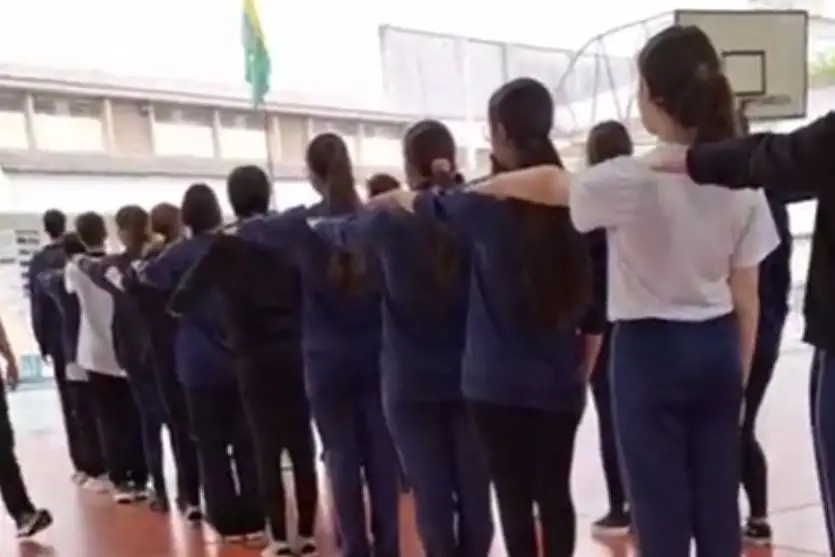 As imagens mostram estudantes uniformizados marchando em formação na quadra da escola enquanto entoam um canto atribuído ao Batalhão de Operações Policiais Especiais (Bope), da Polícia Militar do Rio de Janeiro, com trechos que fazem apologia ao ódio e à violência.