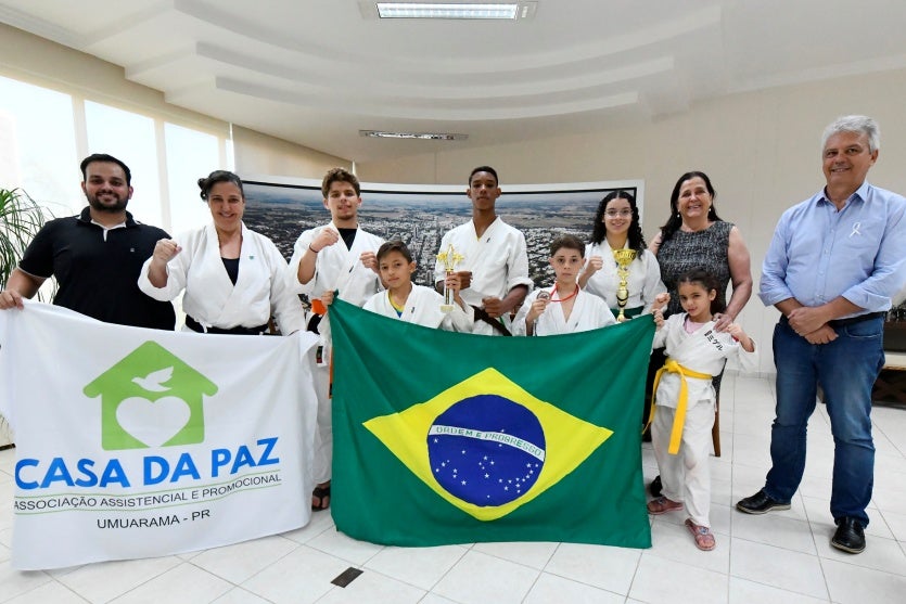 Os atletas da escolinha de karatê da Associação Assistencial e Promocional Casa da Paz visitaram a Prefeitura para agradecer o apoio do Município. A sensei Patrícia Ribeiro Martins acompanhou a garotada.