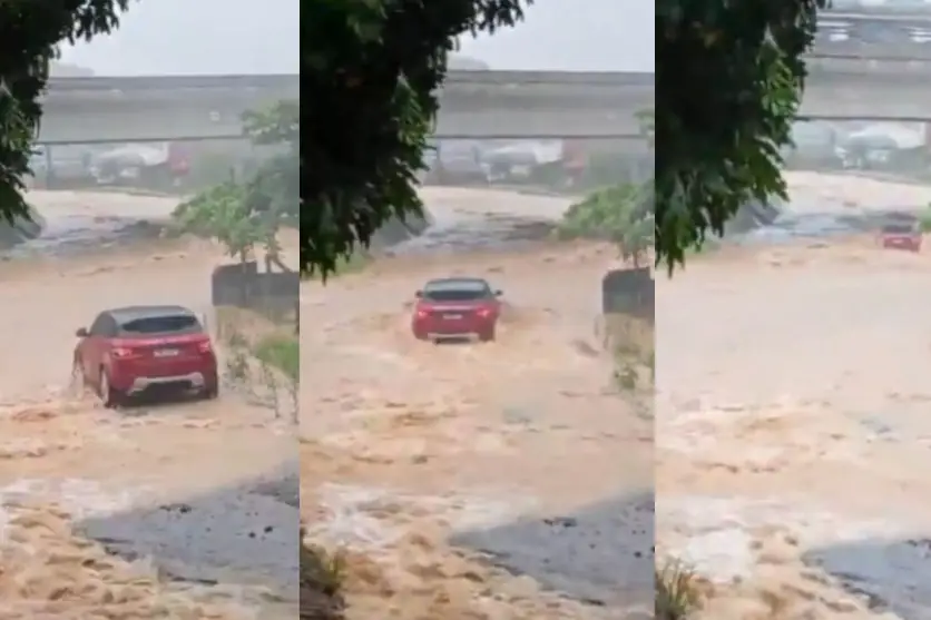 Vídeos que circulam nas redes sociais registraram o momento em que o motorista tenta atravessar a área alagada. O veículo avança lentamente, mas começa a boiar e, em poucos segundos, é arrastado pela correnteza formada na via.