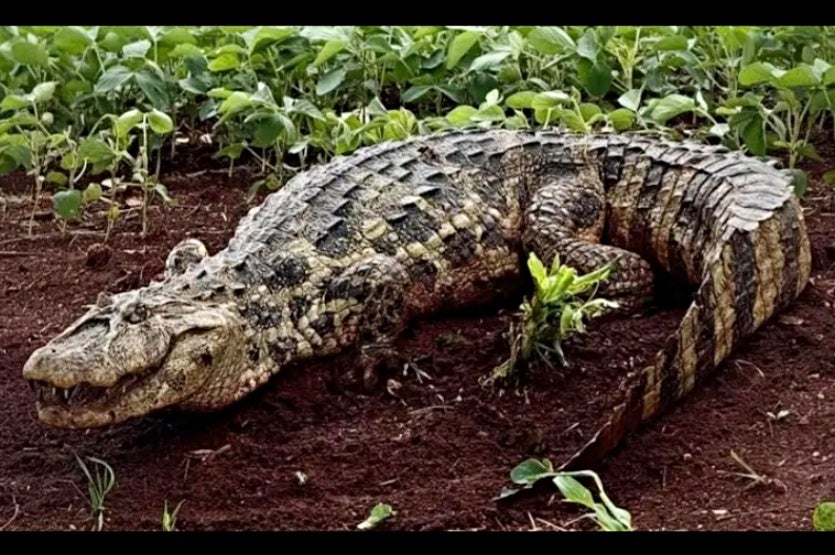 Uma jacaré-fêmea causou espanto após surgir em uma lavoura na margem de uma rodovia no Paraná nesta semana. O animal tem cerca de 2,5 metros e está prenha. O fato inusitado aconteceu na cidade de Sertaneja, na região metropolitana de Londrina.
